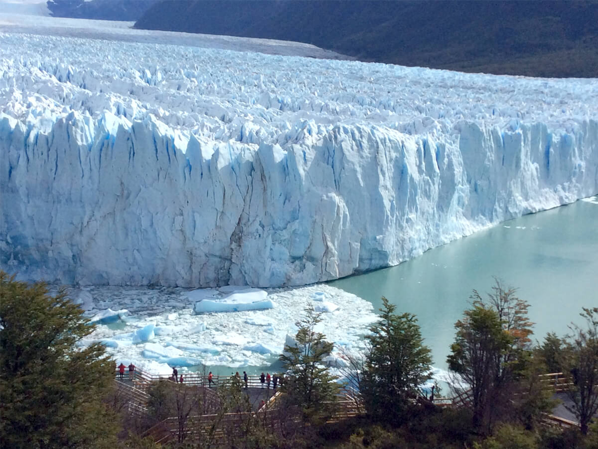 차에서 내리니 약50m높이의 빙하절벽이 호수 위에 우뚝 솟아있다. 이토록 거대하고 깨끗한 빙하를 가까이서 보기는 처음이어서 입이 다물어지지 않는다. 모레노빙하 좌측의 산봉우리는 손가락모양으로 뾰족하게 솟아있고, 빙하위의 무지개가 마치 우리를 환영하는 것 같다.