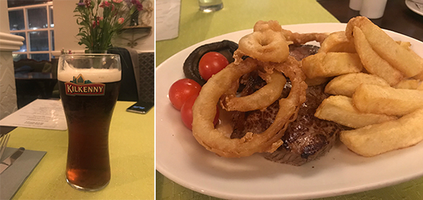 그러나 아쉽게도 이날은 일요일 저녁. 몇몇 식당과 술집을 제외하곤 대부분 불이 꺼져 있고, 그나마 영업하는 식당과 술집에도 손님이 많지 않았다. 금요일이나 토요일이었다면, 아니 일요일만 아니었더라도 이 작은 도시가 얼마나 아름답게 살아났을까? 뻐걱거리는 문 사이로 새어나오는 따뜻한 불빛과 흥겨운 음악과 취객들의 왁자한 흥분. 더블린 같은 대도시가 아닌 서로서로 아는 얼굴들로 이뤄진 작은 중세 도시의 아이리시펍은 또 얼마나 느낌이 있었을까? 그러나 기대했던 아일랜드에서의 첫날 저녁은 분위기 없고, 맛도 없는 스테이크와 그 유명한 ‘킬케니 드레프트’로 만족해야 했다.