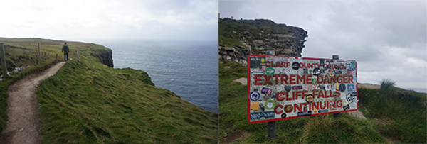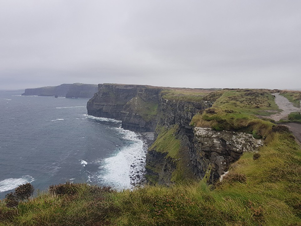 잘 닦인 평탄하고 한적한 길로 접어들었다. 마치 구름처럼 푹신한 길이다. 왼쪽은 양떼가 풀을 뜯는 넓은 초원, 오른쪽은 거친 바람이 불어오는 대서양이다. 정면에서 불어오는 강풍 때문에 자꾸 고개를 숙이고 걷게 된다. 트레일은 아주 완만한 오르막이 이어지면서 바다 쪽으로 절벽이 조금씩 나타난다. 그렇게 얼마간 걷자 저 멀리 높은 언덕 위에 대형 아일랜드 국기가 펄럭인다. 그곳이 전망대인 줄 알고 제법 숨 가쁘게 언덕을 올랐더니 갑자기 눈앞에 거대한 수직 절벽이 펼쳐진다. 높이 200m, 8km의 해안절벽이 여기서부터 시작되는 것이다. 숨이 멎을 것 같아 한동안 멈춰 설 수밖에 없었다.